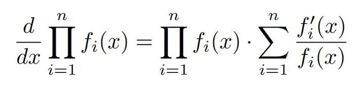 $$\frac{d}{dx} \prod_{i=1}^n f_i(x) = \sum_{i=1}^n f_i'(x) \cdot \frac{\prod_{j=1}^n f_j(x)}{f_i(x)} = \prod_{i=1}^n f_i(x) \cdot \sum_{i=1}^n \frac{f_i'(x)}{f_i(x)},$$