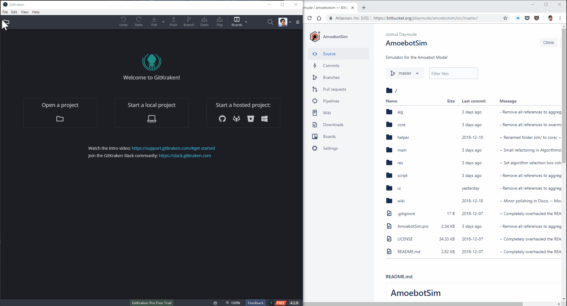 In Git, the remote repository contains the current version of the shared code. Remote repositories can be set up on any server (or even your own workstation), but most people prefer to use a service like GitHub, Bitbucket, or GitLab to host their projects for them, which makes life easier. Think of it like this: GitHub is to Git repositories as WordPress is to websites. You can certainly host your own website, but using a service like WordPress saves you the trouble of maintaining a web server yourself. Our team uses Bitbucket for our AmoebotSim project, so that’s what’ll be in the screenshots.