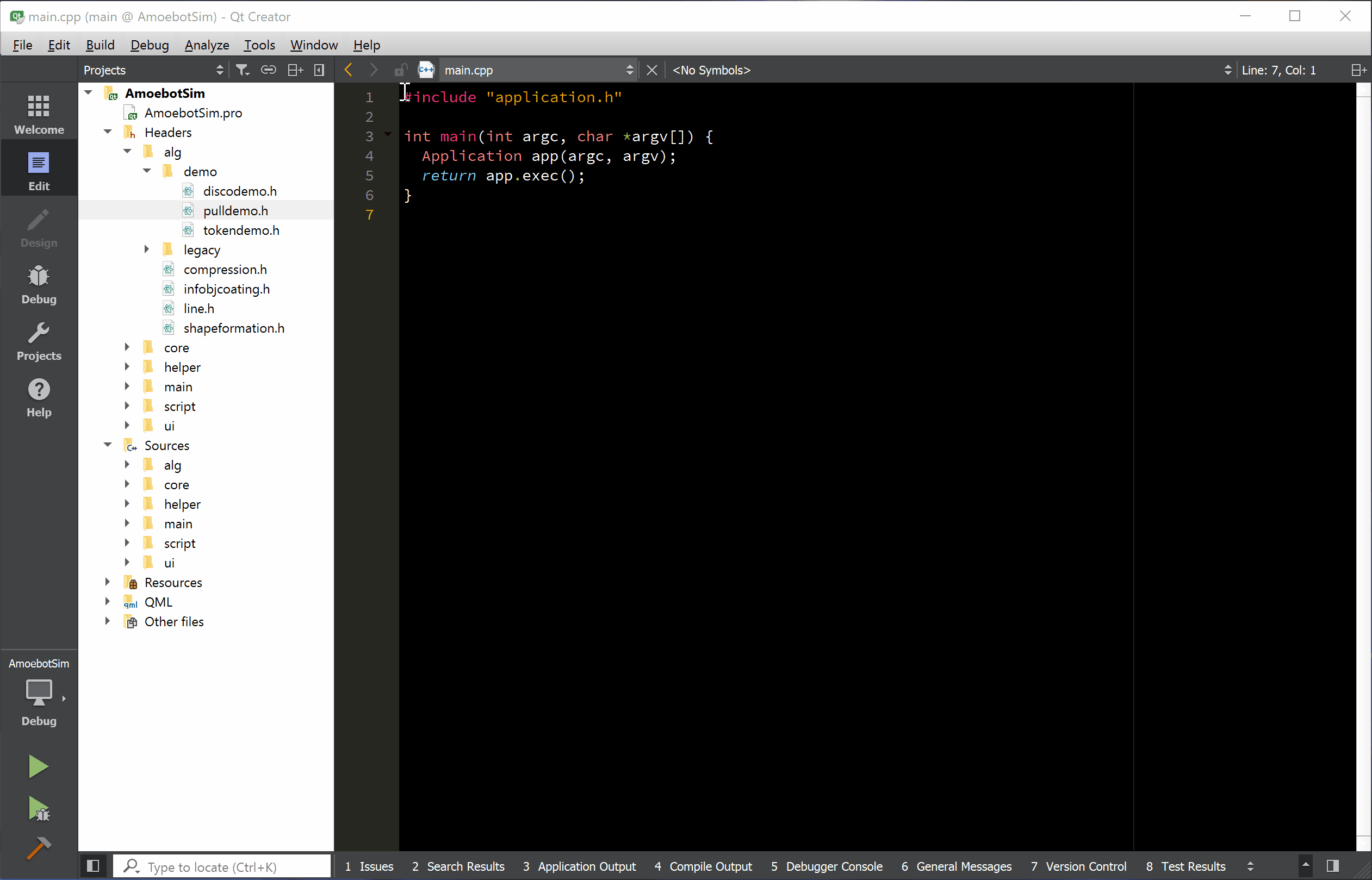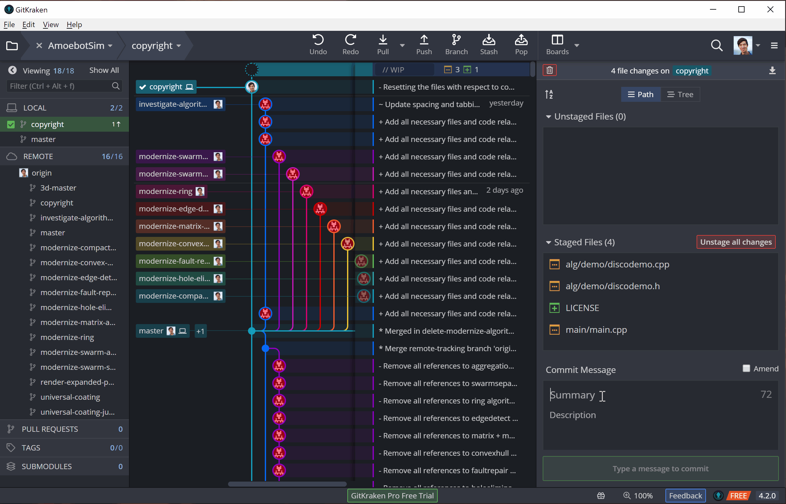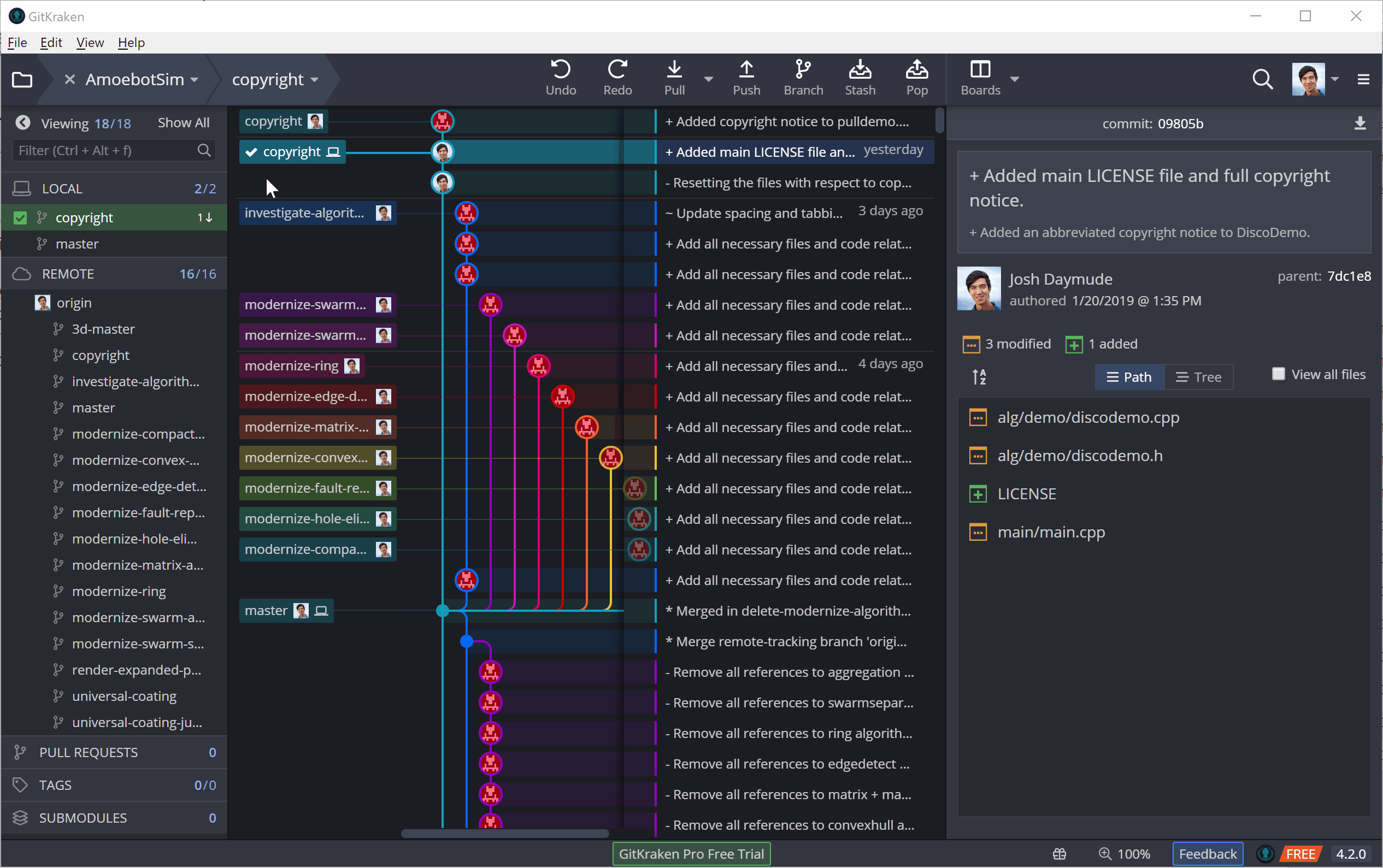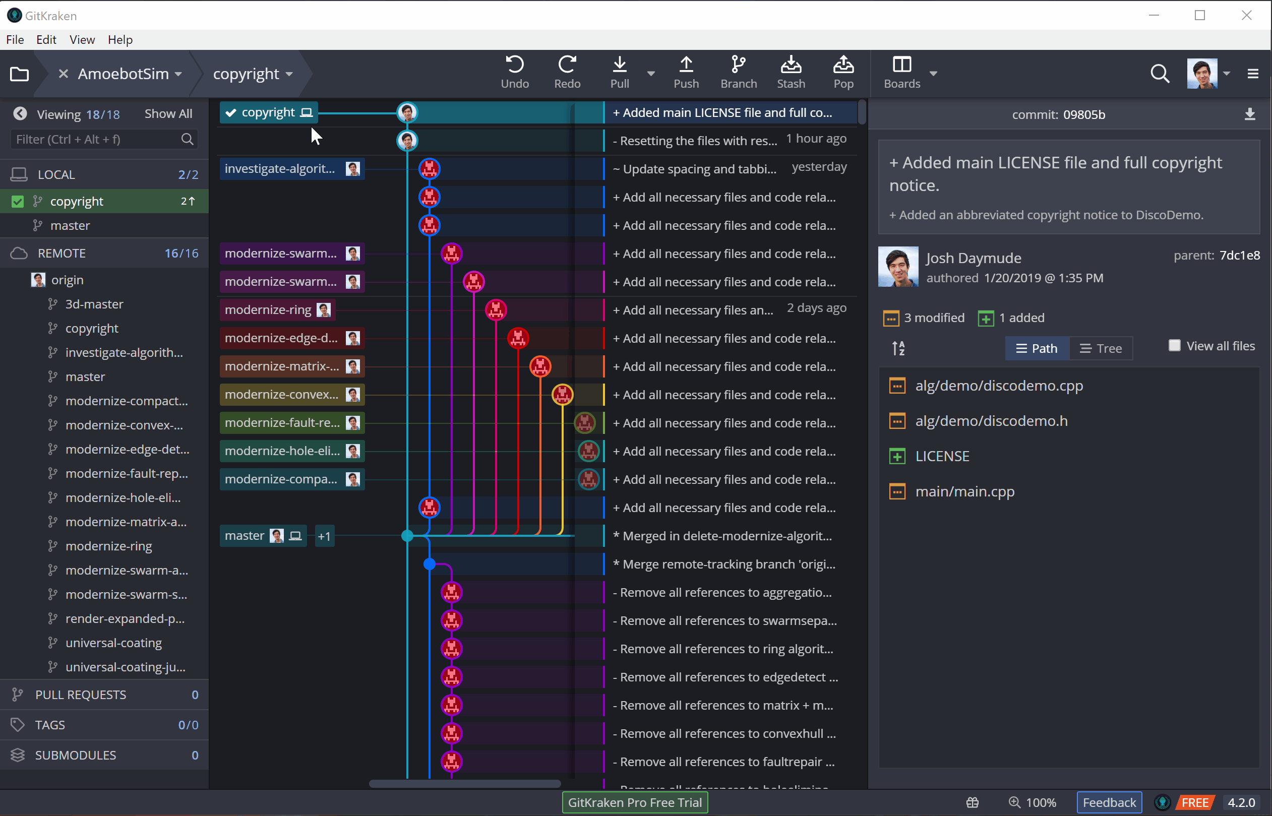 To illustrate this, I’ll be adding license and copyright information to AmoebotSim (a very important part of going open source). I’ll be making these edits in three parts: (1) adding a LICENSE file, (2) adding a copyright notice to our main.cpp file, and (3) adding an abbreviated copyright notice to the other source files. Adding the LICENSE file will initially be an untracked change (it’s a new file), while the other changes that edit existing files will be tracked.