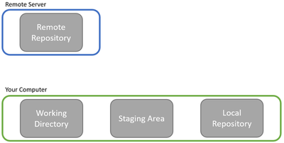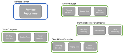 Big picture: there’s the remote server that houses the full software project and all the changes that have been made to it so far, and then there’s your computer where you implement new features and code changes. Now, Git is usually used when writing software collaboratively, so while the above picture is all that you have to worry about, the real setting is more like this:
