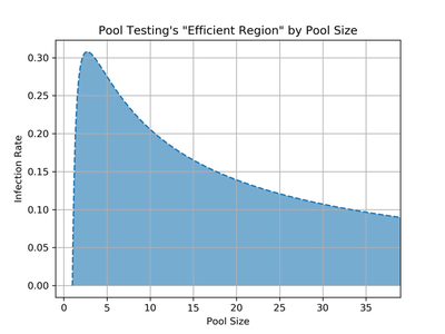 The above graph plots this efficient region. The x-axis is the pool size $p$ and the y-axis is the infection rate $r$. Any point in the blue region represents a $(p,r)$ pair for which pool testing uses less tests than brute force in expectation. For example, with a pool size of $p = 16$, our crude math suggests that pool testing is more efficient for infection rates up to, coincidentally, $r \approx 16\%$. This would be a terrifyingly high infection rate (at the time of this writing, the CDC reports a $\approx 1\%$ positive case rate in the US), so it seems that in realistic settings even one round of pool testing would save a lot of tests.