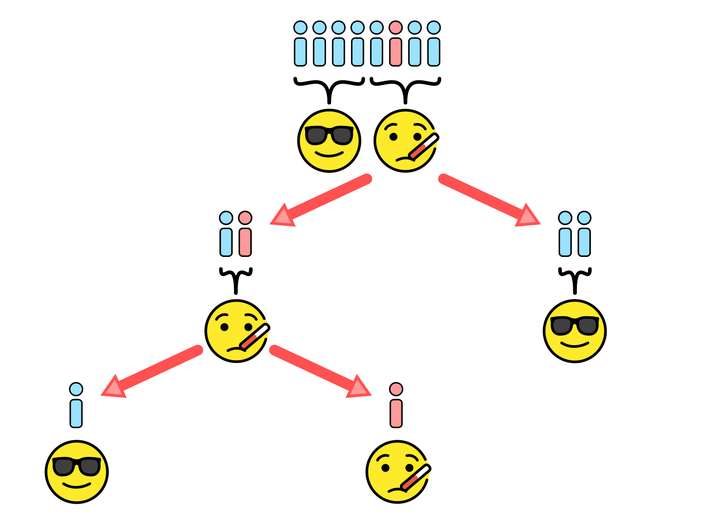 Shifting our perspective on testing from personal experience (“Have I contracted COVID-19?") to the population level (“Who in our communities are positive?"), we can frame testing as a search problem. Among all individuals $(x_1, x_2, \ldots, x_n)$, we want to find those $x_i$’s that are positive for COVID-19 so they can isolate and get timely medical care. In this setting, brute force search would be individually testing every single person — and that’s way more tests than we have. The current US strategy of only testing symptomatic cases isn’t more “efficient” than brute force, it’s just brute force search on a (hopefully) small subset of the total population.