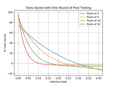The key takeaway is that from a purely test-savings perspective, pool testing does a remarkable job for any reasonable pool size. While it is true that pool testing can end up using more tests than traditional testing if the infection rate grows too large, my crude math suggests that the infection rate would need to be quite high ($r > 10\%$) before this inefficiency would be noticeable. At today’s US infection rate of $r \approx 1\%$, we could be $70\%$ more efficient with our limited supply of testing reagents, helping more people get tested more often. Perhaps if this technique were widely used, we would all be that much closer to safely getting on with our lives.