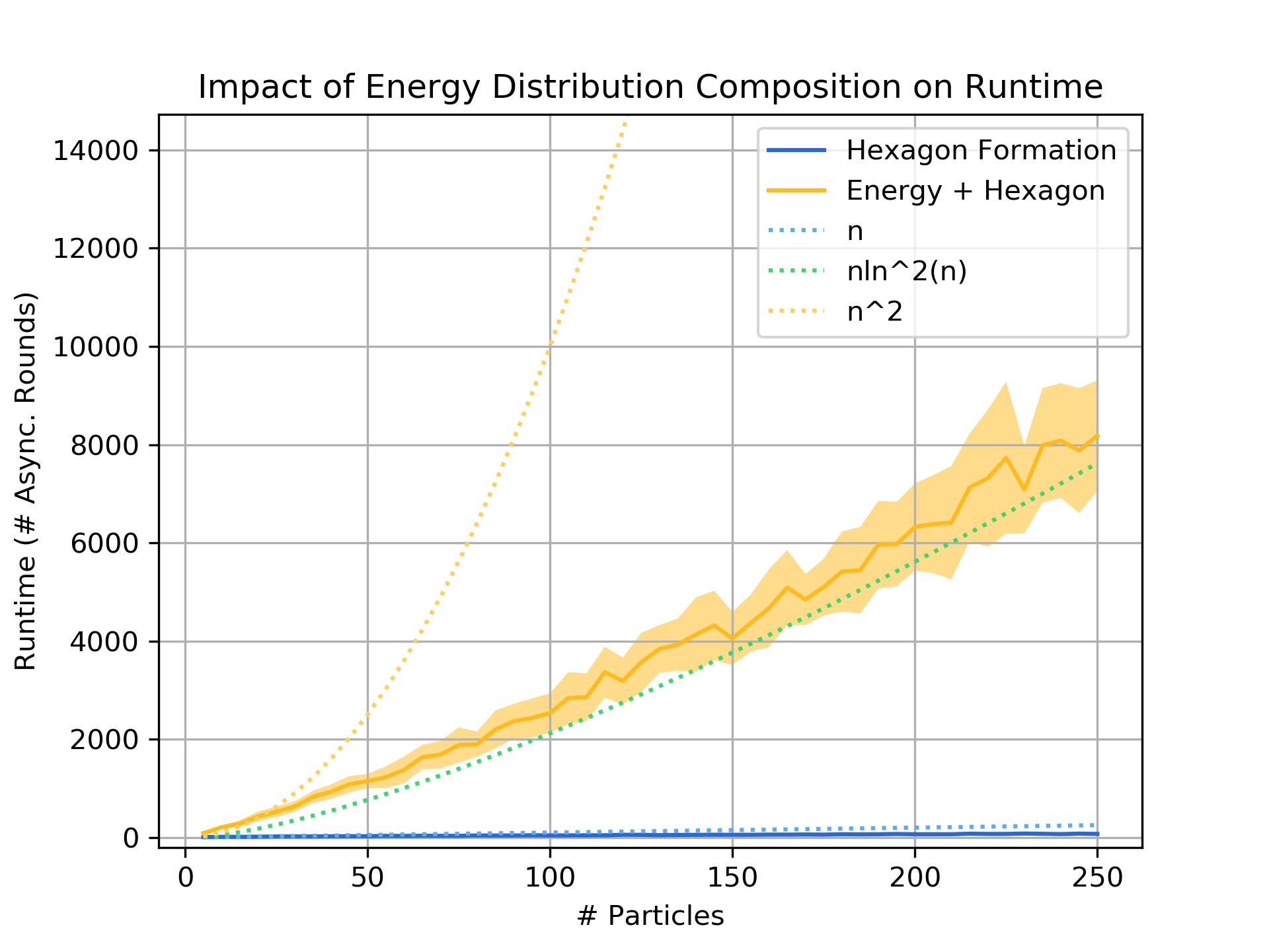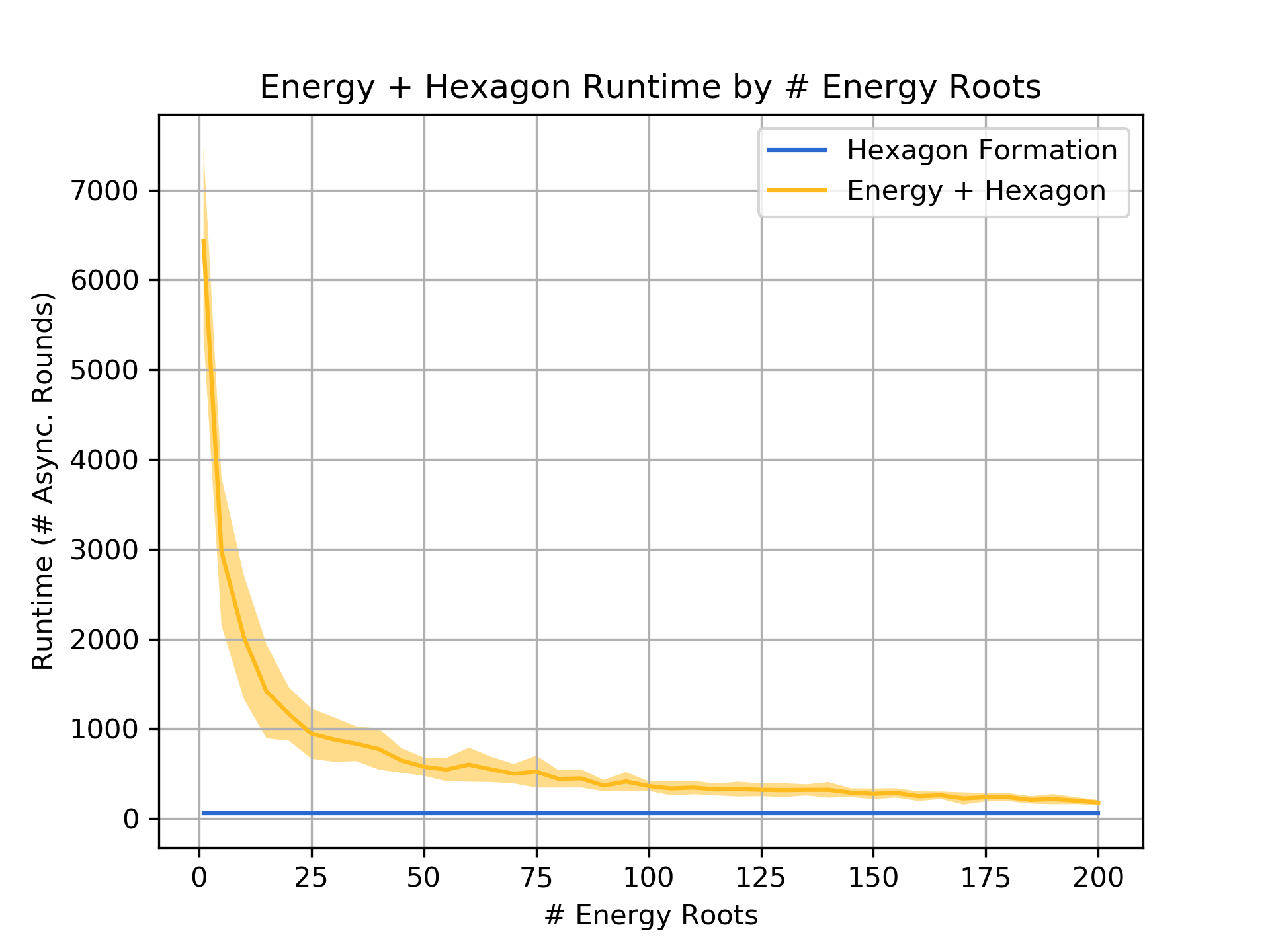 Since Energy-Sharing meets the system’s energy demands every ${\cal O}(n)$ asynchronous rounds and Forest-Prune-Repair repairs any disruptions to the communication structure as particles move, a composed algorithm will not be impeded by the underlying energy distribution primitive, but may add significant overhead to its runtime. However, we observe reasonable performance in practice: for example, since hexagon formation terminates in ${\cal O}(n)$ rounds, our proven bounds suggest that the composed algorithm could terminate in time ${\cal O}(n^2)$ or worse but the graph below demonstrates an overhead that appears asymptotically sublinear. With the addition of more energy roots, the composed algorithm is dramatically faster, approaching the runtime achieved without energy constraints.