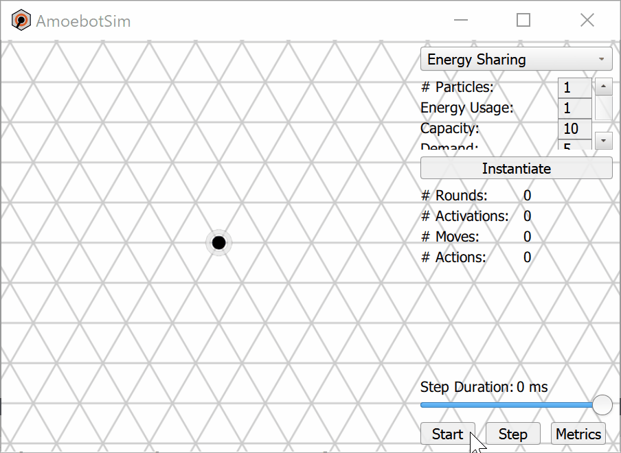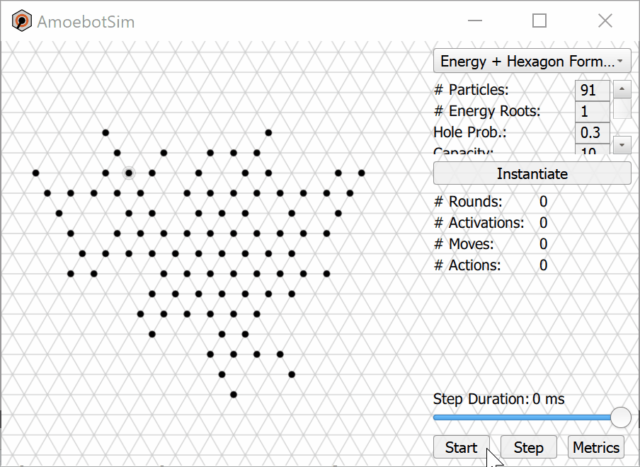 The Energy-Sharing algorithm relies on an underlying spanning forest structure to communicate its stress/inhibition signals. However, if particles move as they often do in collective behaviors, this disrupts the communication structure. Thus, the Forest-Prune-Repair algorithm can be used as an underlying primitive in Energy-Sharing so that Energy-Sharing can be composed with existing amoebot model algorithms, extending them to consider energy constraints. Below is an example of Energy-Sharing composed with Basic Shape Formation, corresponding to Figure 5 in the paper.