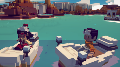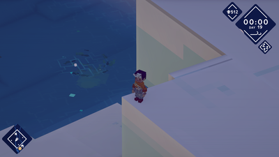 An identity crisis starts to emerge when my largely nautical experience is disrupted by the ability to disembark and do some light walking exploration. In town, this is painful, as any elevation change results in weird voxel-clipping that makes it entirely unclear when I can safely go up or down steps. Out on the sea, I walk for fifteen minutes along a gigantic ice bluff that’s so tall (and evidently not designed to walk on) that it clips out of the camera’s range. Turns out there’s nothing to find—not even a cool view—and there was no reason for the game to let me come here.