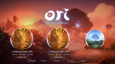 Improved replayability deserves its own treatment. In Ori and the Blind Forest, collectibles were limited to Life and Energy Cells that increase the amount of health and ability energy Ori has, respectively. After finishing the main story, achievements and 100%-ing the game are the only incentives for finding all these secrets. In Ori and the Will of the Wisps, however, side quests and new collectibles give meaning to the secret hunting. With Gorlek Ore that Ori collects, Grom builds new structures in the Wellspring Glades for Moki to live in. Tolek plants Seeds that synergize with Ori’s abilities to make new areas of the Glades accessible. Ability Shards unlock useful augmentations of Ori’s abilities. Hardcore fans can take on the “*-less run,” requiring a complete run in under 4 hours without dying, spending Spirit Light, or equipping shards. These goals enhance the actual play experience, greatly improving the replay value.